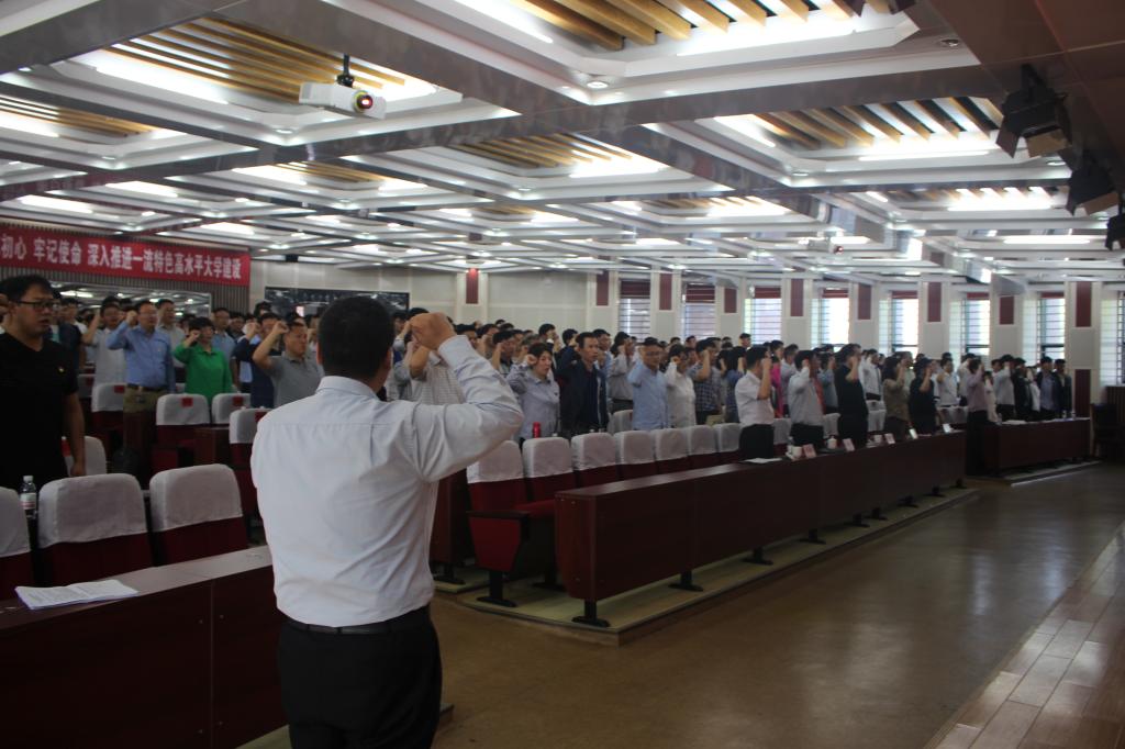 为切实增强“四个意识”,牢固树立“四个自信”,坚定不移推进全面从严治党,加强党员党性修养。2018年6月6日下午,FIFA官网中文版入口党总支于主教学楼一楼西报告厅举行全体党员重温入党誓词活动。校党委副书记、校长谭秀森同志、校长办公室主任郭建锋同志、组织部副部长冯英豪同志及FIFA官网中文版入口全体师生党员参加宣誓活动。