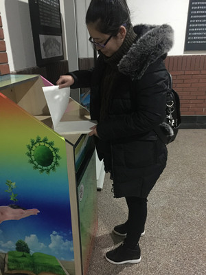此次活动主要以回收废纸为主,生活部同学自己动手,制作了精致的废纸回收箱收集废纸,放置在教学楼入口处,得到了大家一致好评。同学们也主动将用过的废纸投到回收箱中,对于垃圾的回收利用起到了非常积极的作用。同时,学生会还在回收箱上放了未用过的新纸,在回收旧纸的同时,还可以自助拿一些新纸用,极大地方便了同学们的学习生活。