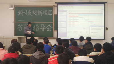 20161124日中午,机械学院在教学楼B329举行科技创新项目答疑指导会。本次会议由往届参加省机电创新大赛的优秀参赛代表邢旭东、何毅、董勇志、学术部部长王克楠给大家做答疑指导。