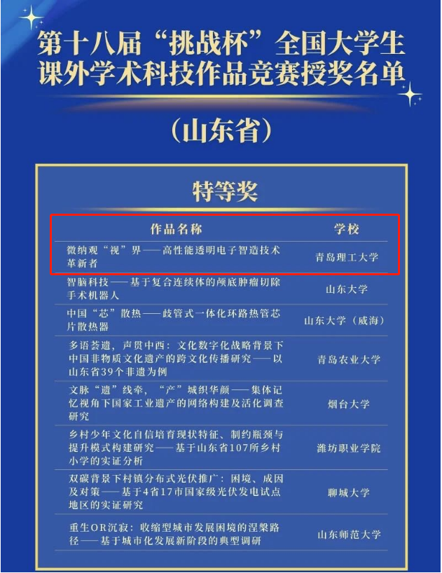 10月30日,第十八届“挑战杯”全国大学生课外学术科技作品竞赛在贵州大学落下帷幕,经过激烈角逐,FIFA官网中文版入口参赛项目《微纳观“视”界——高性能透明电子智造技术革新者》(指导教师:朱晓阳、兰红波、杨建军;团队成员:王瑞、周君仪、段培开、张友超、商帅、台玉平、于志浩、张金宝)勇夺主体赛全国特等奖,创造了世界杯官网在此项竞赛中首次获特等奖记录。此项成绩也是2026世界杯官网在“挑战杯”系列竞赛中的最好成绩,实现了赛事重大突破。