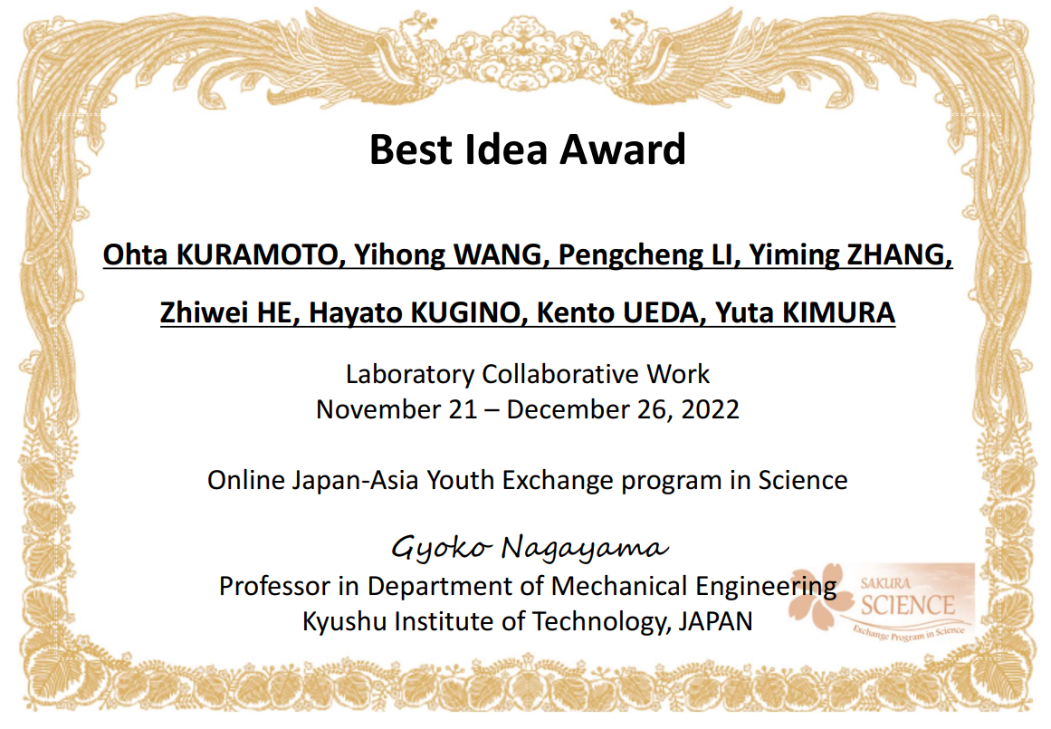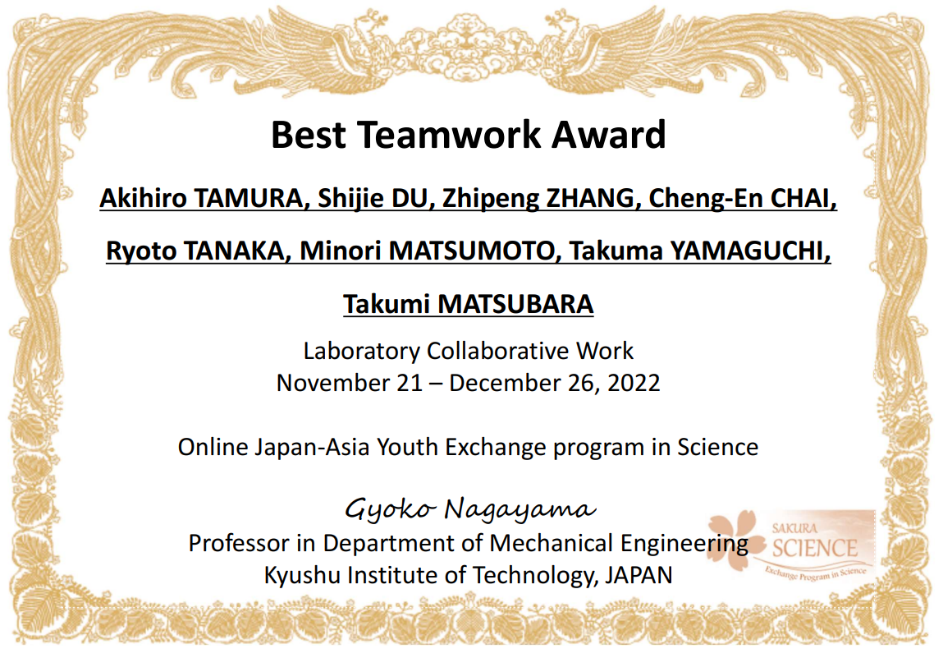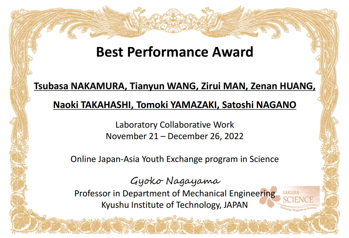 依托FIFA官网中文版入口郭峰教授和日本九州工业大学工学部机械工程系长山晓子教授申报的日本科学技术振兴机构(JST)“樱花科技计划”项目,2022年11月14日-12月26日,FIFA官网中文版入口共计9名师生参加了为期一个半月的樱花计划线上学术交流活动。本次活动的目的在于促进青年师生间的国际交流合作。参加单位包含日本九州工业大学、2026世界杯官网、东北大学、山东大学、齐鲁工业大学、台湾科技大学及韩国蔚山大学。本次交流活动主要包含学术报告、实验室线上参观及协作项目三部分。