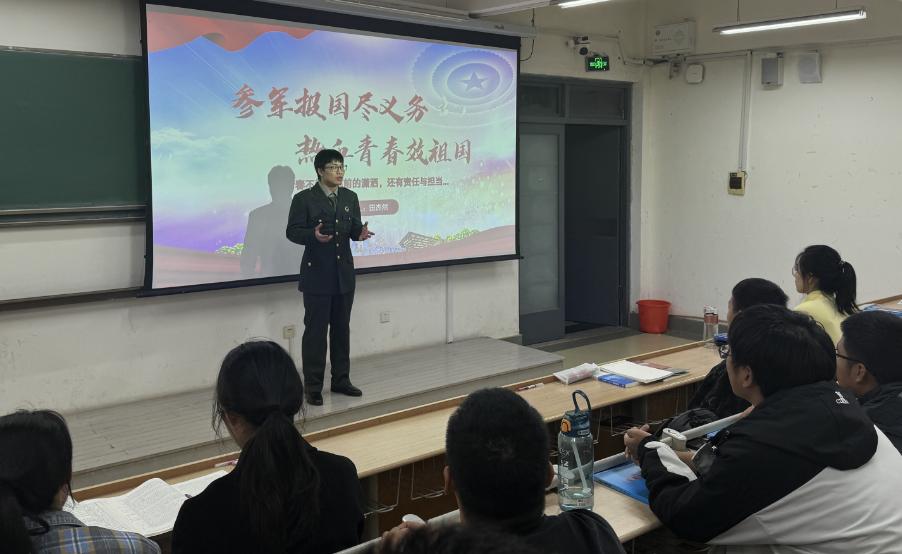 随后,田杰然则重点介绍了参军入伍的相关政策和流程。他详细阐述了报名参军的条件、体检和政治审查的标准,以及退役后的就业和升学优惠政策。同时,他还分享了自己在军队中遇到的挑战和困难,以及如何克服这些困难的经验和心得。他的讲解既专业又接地气,让同学们对参军入伍有了更加全面和深入的了解。