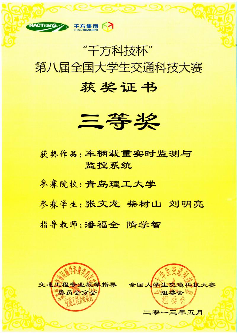 5月25日至26日,由教育部高等学校交通运输与工程学科教学指导委员会主办、北京工业大学承办,以“顺畅交通”为主题的第八届全国大学生交通科技大赛决赛在北京举行。本届大赛共有全国86所大学报名,198件作品参加选拔,经过专家组评审,仅有来自51所学校的80件作品进入决赛。世界杯官网由潘福全、隋学智老师指导,张文龙、柴树山、刘明亮同学合作完成的《车辆载重实时监测与监控系统》荣获三等奖。