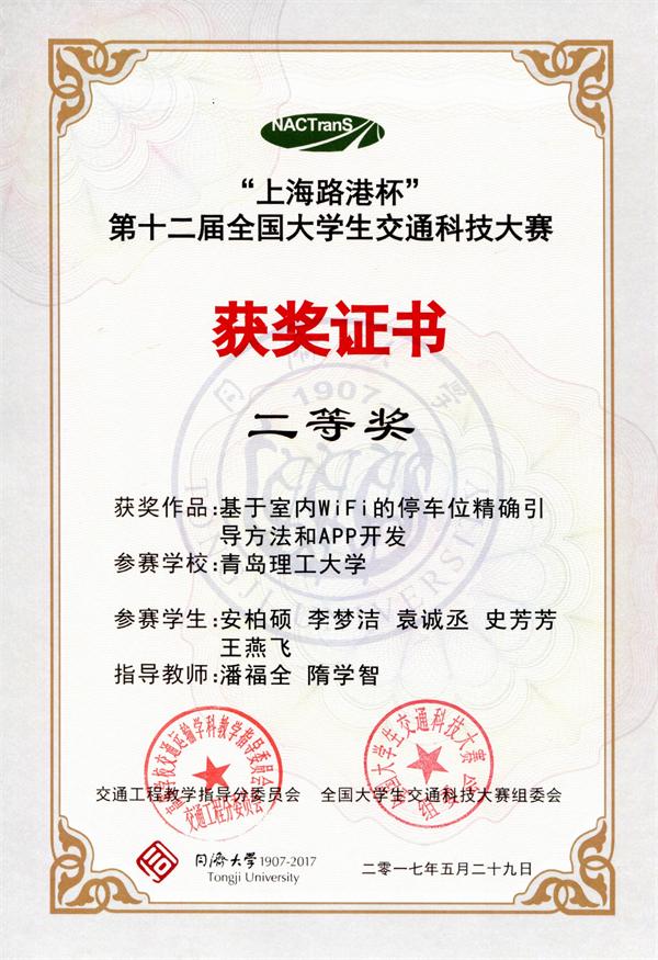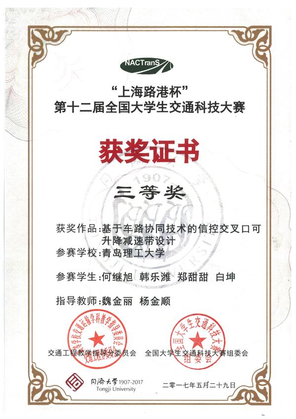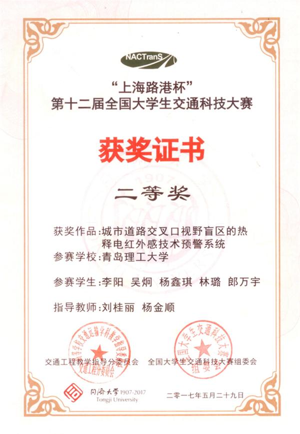 本届大赛共有全国120所高校报名,在初赛作品报送阶段,共有95所高校提交了302件作品;经过专家组匿名通讯评审,目前有来自51所高校的80件作品通过选拔进入决赛,世界杯官网三份作品进入决赛。参赛作品《基于室内wifi的停车位精确引导与APP开发》》(作者:安柏硕、王燕飞、李梦洁、袁诚丞、史芳芳 指导老师:潘福全 隋学智)及《城市道路交叉口视野盲区的热释电红外感技术预警系统》(作者:李阳 吴炯 杨鑫琪 林璐 郎万宇 指导老师:刘桂丽 杨金顺)在决赛中均取得了二等奖的优异成绩;《基于车路协同的信控交叉口可升降减速带设计》(作者:郑甜甜、何继旭、白坤、韩乐潍 指导老师:魏金丽 杨金顺)获得三等奖。