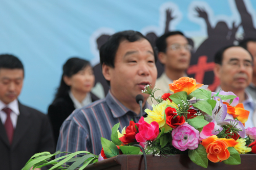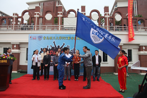 青岛汽车行业协会秘书长李伟在发布会上致辞。校团委书记陈伟向车队授予了出征旗帜。