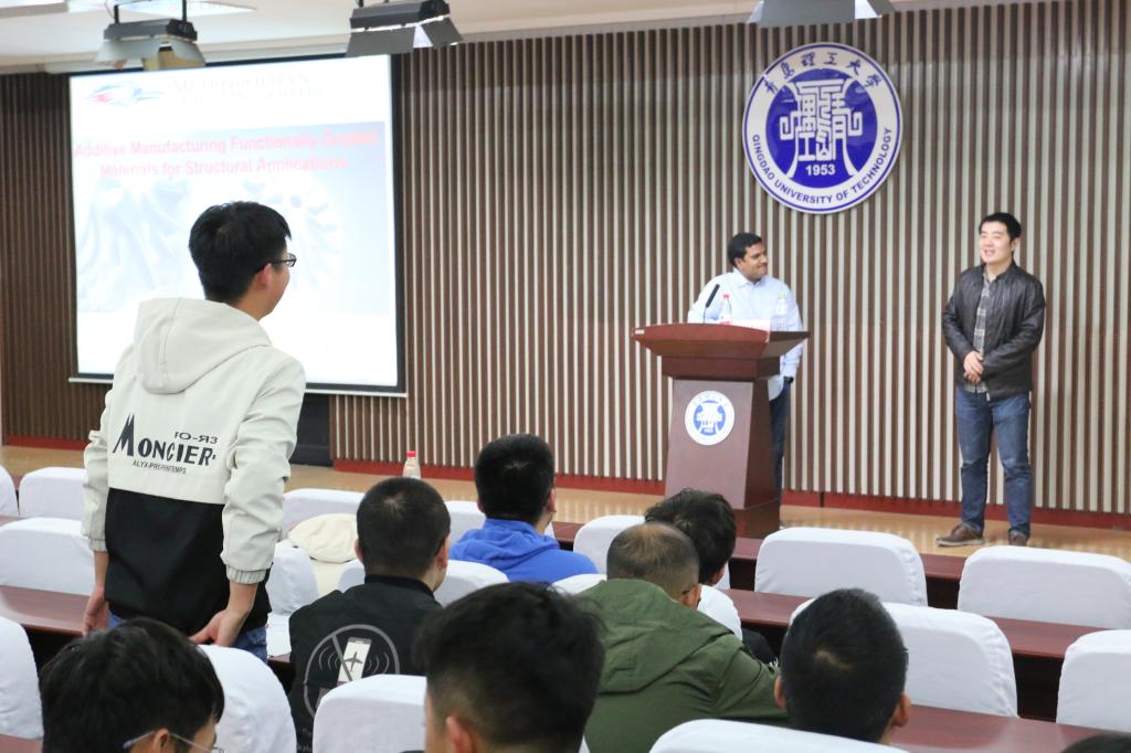 报告中,Devi Kalla教授介绍了增材制造的基础理论以及现有技术,如DLP、SLA等,并就功能梯度材料(FGM)展开了详细介绍。Devi Kalla教授主要阐述了功能梯度材料的应用领域、优势和前景,以及与复合材料的区别和存在的研究难点,并重点介绍了当前两种主要类型的金属增材制造方法:直接金属激光烧结(DMLS)和直接能量沉积(DED)。同时,Devi Kalla教授与大家一起讨论了金属梯度材料的机械性能和工业应用等相关问题。最后,Devi Kalla教授与在场的学生进行了热烈的讨论与互动,并耐心的解答了同学们提出的问题,对学生所感兴趣的内容进行了热心的指导。Devi Kalla教授讲解幽默风趣,内容引人入胜,赢得在场师生的阵阵掌声。