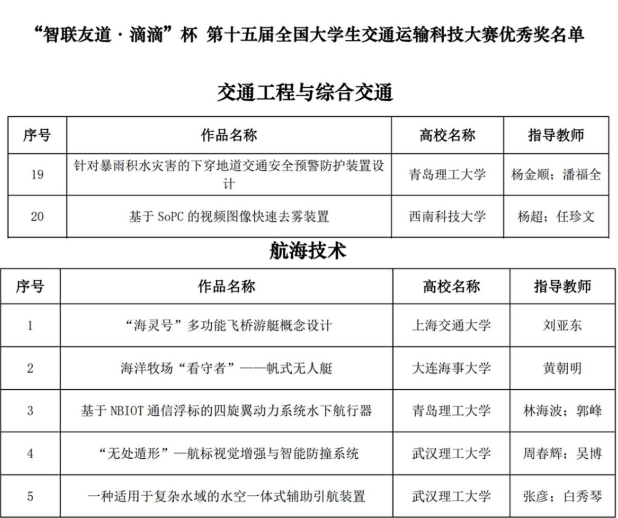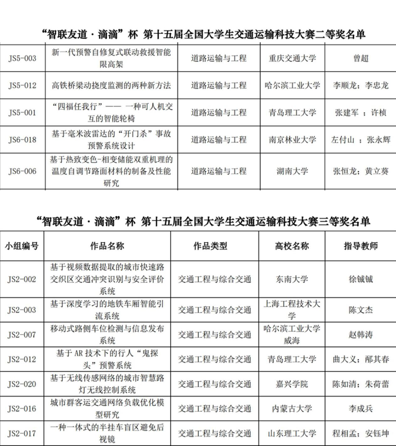 由教育部高等学校交通运输类专业教学指导委员会主办的全国性大学生科技竞赛“智联友道·滴滴”杯第十五届全国大学生交通运输科技大赛于2020年11月28日在北京交通大学举行,世界杯官网FIFA官网中文版入口所派出的参赛队伍共荣获二等奖一项,三等奖一项以及优秀奖两项。本次大赛共有162所高校的656件作品报名参赛。最终来自71所高校的150件作品进入决赛。此次全国大学生交通运输科技大赛根据疫情防控要求,采取“线上答辩展示+线下集中评审”的方式进行。