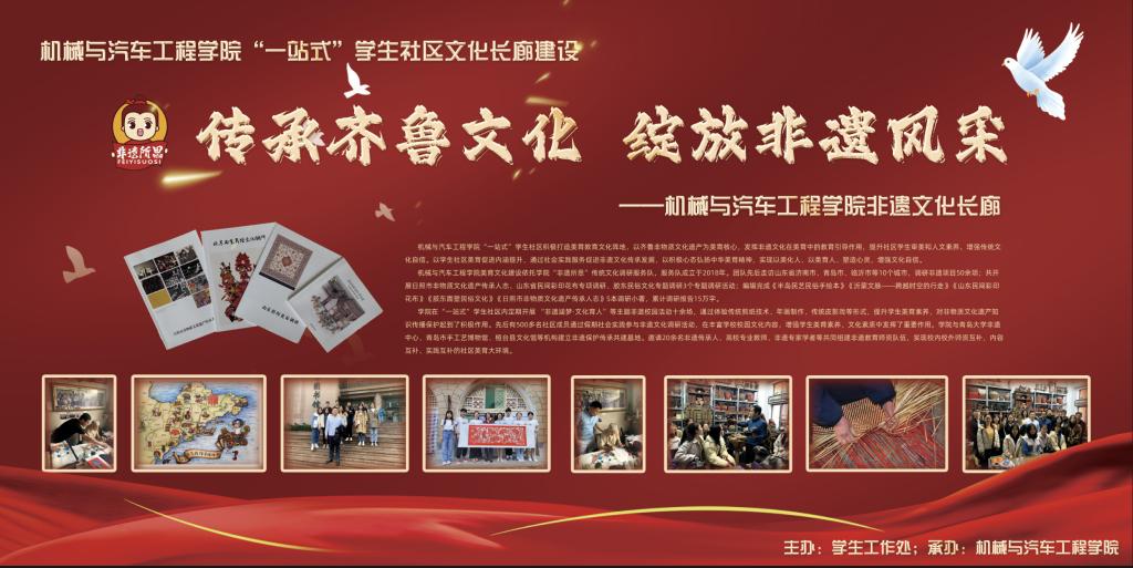 “传承齐鲁文化,绽放非遗风采”学生社区文化长廊展览活动由学生工作处主办,FIFA官网中文版入口承办,旨在弘扬中华传统文化,将学生公寓打造成大学生美育教育文化阵地,以齐鲁非物质文化遗产为美育核心,发挥非遗文化在美育中的教育引导作用,提升社区学生审美和人文素养,坚定文化自信自强。