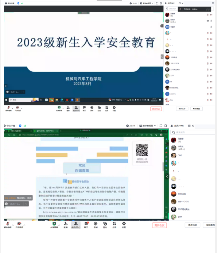 会上,新生辅导员对参会家长表示衷心感谢,详细讲解了近期学生比较关注的报到事宜、入校指南、入校安排等问题,并在交流答疑环节与学生家长进行了耐心细致地沟通;为提高学生安全防护意识,共筑安全屏障,新生辅导员为各位新生及家长送上云端“安全教育第一课”,结合校园典型案例,围绕防诈骗、防溺水、人身安全、交通安全、校园安全等方面开展新生入学安全教育,特别提醒学生及家长要警惕近期频发的网络电信诈骗,做到“不轻信、不透露、不转账”,家校合力筑牢学生安全防线。会议最后,组织观看学院为新生入学准备的微视频,初步了解学院概况、专业设置、人才培养和科技创新等情况。