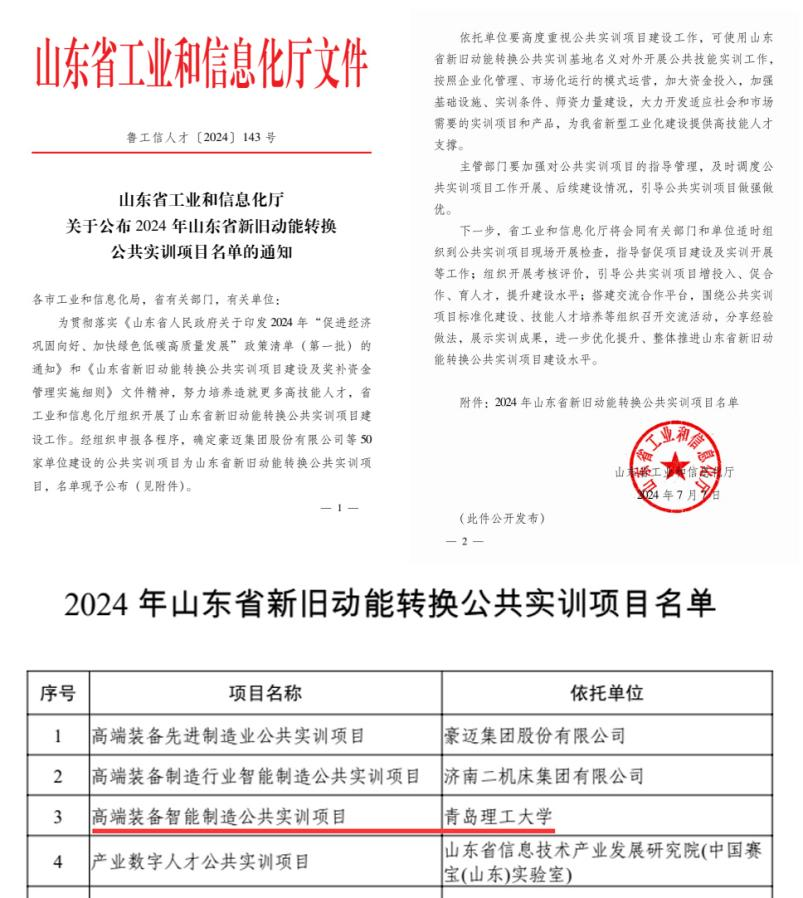 近日,山东省工业和信息化厅下发了《关于公布2024年山东省新旧动能转换公共实训项目名单的通知》,世界杯官网申报的“高端装备智能制造公共实训项目”成功入选,这是世界杯官网首次获得该类型项目支持。