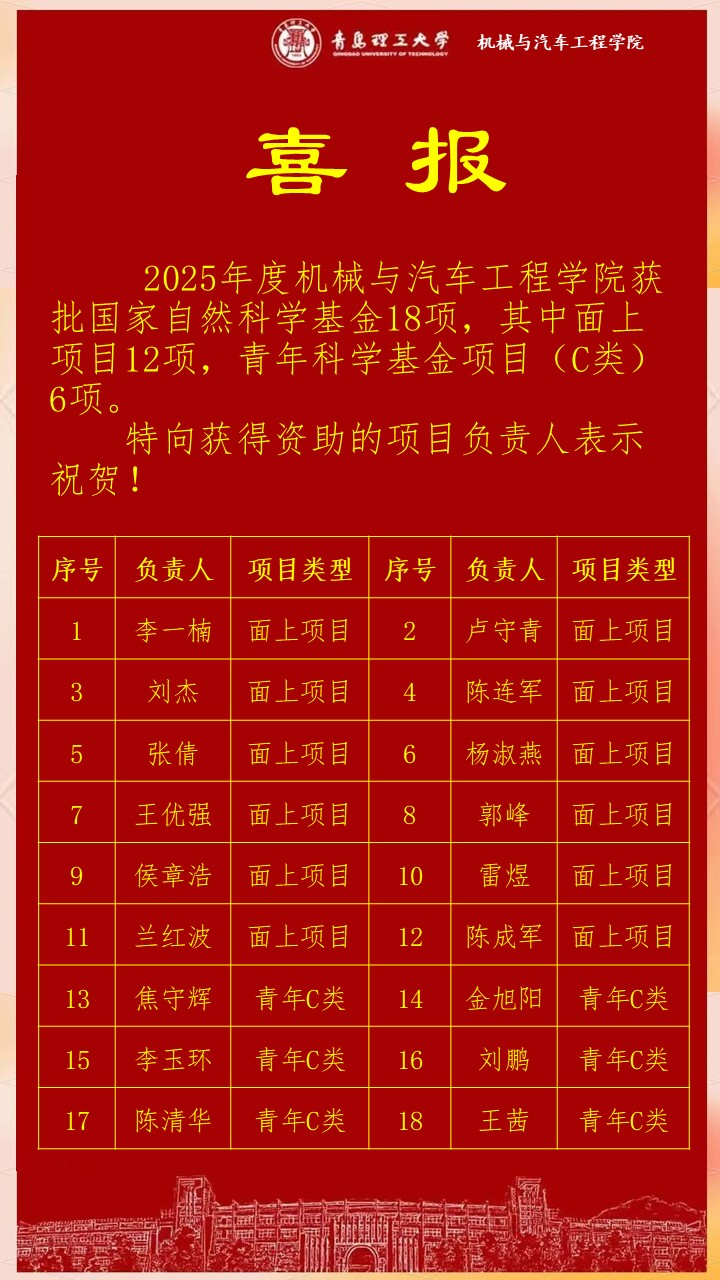 此次获批的项目涵盖面上项目、青年科学基金项目等多个类别。其中,面上项目12项,青年科学基金项目6项。学院教师在多个研究领域展现出强劲实力,如摩擦与润滑技术、安全科学与技术、3D打印与先进制造技术等多个方向均有斩获。这些项目的获批,不仅体现了学院在基础研究和应用基础研究方面的深厚积淀,也彰显了教师们卓越的科研能力和创新精神。