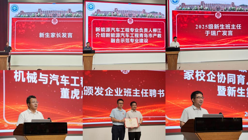活动现场,一汽人力资源部部长兼产品线人力资源室主任毛振东向“家校企”协同育人创新班的学员表示欢迎,他指出“家校企”协同育人模式着力解决的是“本领恐慌”“能力不足”的问题,希望同学们要保持开放态度,取长补短,共同促进;新能源汽车工程专业负责人柳江介绍新能源汽车工程青岛市产教融合示范专业建设目标和期望;学院汽车系主任尹浩为毛振东颁发“企业班主任”聘书,表示作为企业班主任将通过专题讲座、实践指导、职业规划座谈等形式,全程参与学生培养,为学生搭建起从校园到职场的“桥梁”。新生家长代表张弛在发言中表示,“企业班主任‘上岗’保驾护航,不仅能帮助孩子及时了解行业动态,还能让孩子提前学习岗位所需技能,这让我们家长很放心。”2025级新能源汽车工程专业班主任于瑞广表示,将与校企双班主任协同发力,通过“家-校-企”三位一体的联动培养模式,整合家庭教育资源、学校教育优势和企业实践平台,形成育人合力,助力学生更早确立职业发展方向,实现成长成才。校企双方就围绕新能源汽车领域人才培养需求,共同制定课程体系、开发实践教学项目,把企业的技术资源、岗位资源转化为育人资源等方面进行深入的讨论交流。