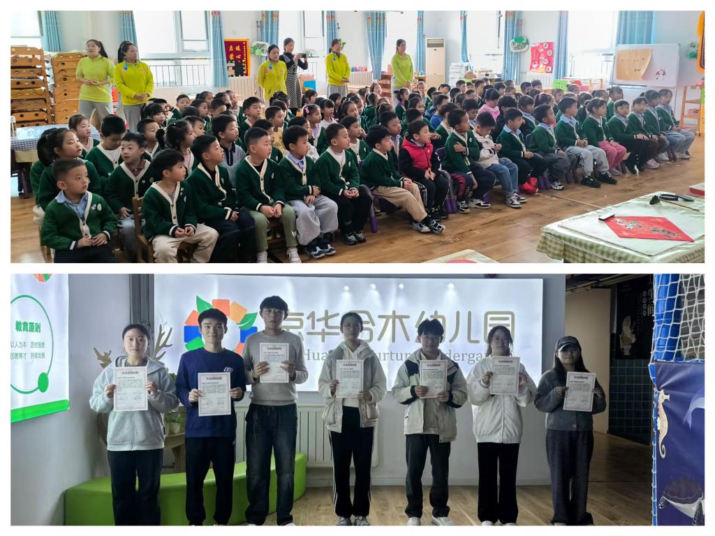 时值重阳佳节,墨韵书法协会特别书写“福寿安康”吉语赠予京华合木幼儿园,表达美好祝愿。幼儿园也为参与活动的同学颁发了社会实践证书,双方合影留念,为此次活动画上圆满句号。