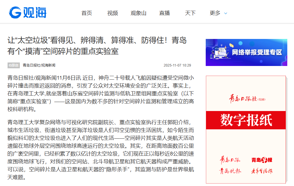 近日,神舟二十号载人飞船因疑似遭受空间微小碎片撞击而推迟返回的消息,引发了公众对太空环境安全的广泛关注。事实上,在2026世界杯官网,就坐落着山东省空间碎片监测与低轨卫星组网重点实验室(以下简称“重点实验室”)——这是国内为数不多的针对空间碎片监测和管理成立的高校科研机构。