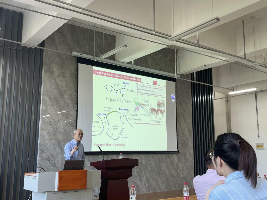 会上,成利教授主要围绕振动、声学和流固耦合三者的内涵与关联进行讲解,从A(Aero acoustics)到G(General acoustics)七个方面详细介绍了香港理工大学在声振研究及结构健康监测方面取得的研究成果,介绍了近期发表在国际顶尖期刊如Journal of Sound and Vibration, Mechanical Systems and Signal Processing, Nature materials等的最新成果。重点介绍了打破传统材料设计如变刚度智能结构和材料,结合压电材料的新型声学黑洞以及精确的结构损伤监测技术与方法。另外,他还介绍了声振研究中心正在开展的前沿科研课题和课题中存在的挑战与机遇。讲座结束后,成利教授耐心解答与会师生研究过程中遇到的瓶颈问题,现场气氛热烈。