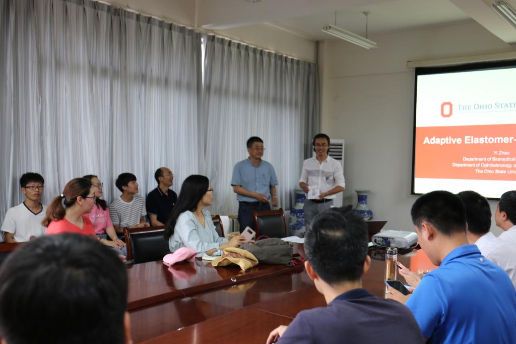 7月12日上午,应世界杯官网FIFA官网中文版入口彭子龙副教授邀请,美国俄亥俄州立大学( The Ohio State University )工程学院Yi Zhao教授在嘉陵江路校区主教学楼A414做了题为“Adaptive Elastomer-Liquid Lenses”学术报告。郭峰院长主持报告会,副院长王优强、相关专业教师及研究生40余人参加。