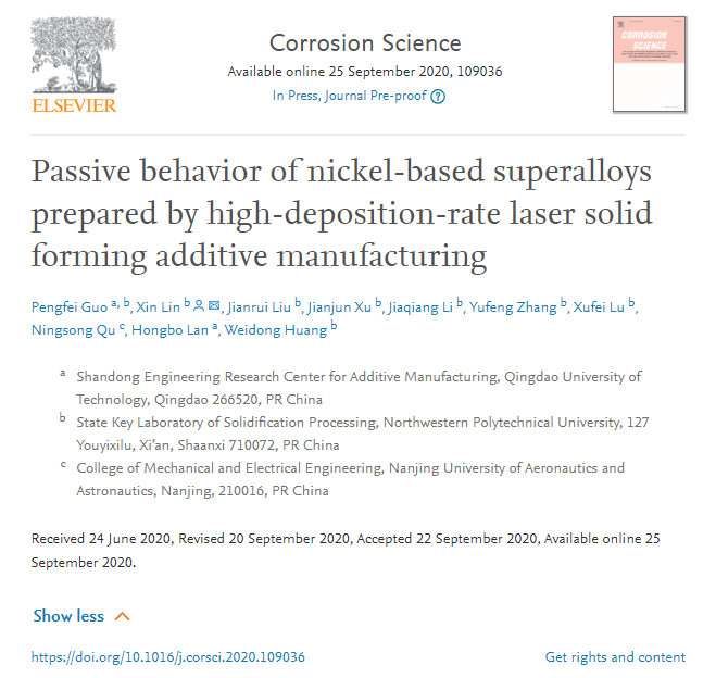 世界杯官网青年教师郭鹏飞博士联合西北工业大学黄卫东教授、林鑫教授团队和南京航空航天大学曲宁松教授团队,开展了航空发动机用镍基高温合金典型牌号Inconel 718合金(国内牌号为GH4169)的高沉积速率激光立体成形实验。基于激光熔池形貌及温度场数值模拟,揭示了高沉积速率条件下沉积态组织织构的演化规律;通过观察钝化膜的原子尺度结构、成分特征,利用点缺陷模型(Point Defect Model)理论,阐明了钝化膜诱导沉积态试样电化学活性各向同性的作用机理。相关成果以题为“Passive behavior of nickel-based superalloys prepared by high-deposition-rate laser solid forming additive manufacturing”的论文发表在材料腐蚀领域顶级期刊《Corrosion Science》上。论文链接:https://doi.org/10.1016/j.corsci.2020.109036。论文第一作者为世界杯官网FIFA官网中文版入口郭鹏飞副教授,第一署名单位为2026世界杯官网山东省增材制造工程技术研究中心。该研究得到了科技部国家重点研发计划项目(No. 2018YFB1105901)的支持。