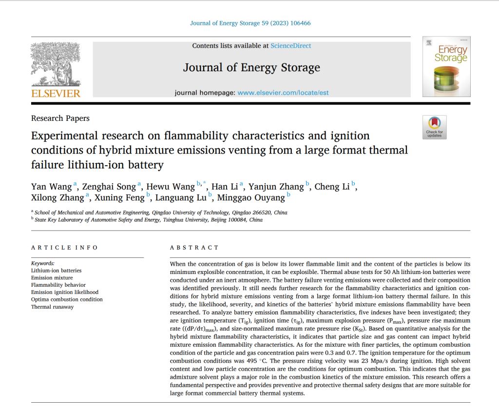 近日,FIFA官网中文版入口青年教师王炎副教授与其硕士研究生宋增海在高比能锂离子动力电池失效释放物气固混合相着火性能及其引燃边界方面取得阶段性研究进展,在权威期刊《Journal of Energy Storage》(IF=8.907,JCR Q1)上发表了题为“Experimental research on flammability characteristics and ignition conditions of hybrid mixture emissions venting from a large format thermal failure lithium-ion battery ”的研究论文。该研究成果系FIFA官网中文版入口教师与清华大学欧阳明高院士电池安全课题组联合研究重要成果,2026世界杯官网机械与汽车学院为第一署名通讯单位,第一作者为王炎副教授,通讯作者为清华大学车辆与运载学院王贺武研究员。